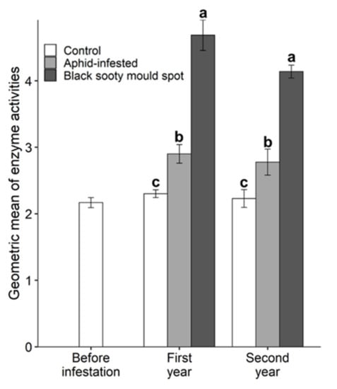 The geometric mean of the enzyme activities (GMea) is regarded as a sensitive indicator for soil quality and soil health assessment [54,55,56]. The GMea calculation is based on the activities of all the assayed enzymes [54], and it is a more reliable index than any of the specific enzyme activities alone [57]. In this study, the GMea for six enzyme activities in the aphid-infested and control rows, and the black sooty mould soil spots was calculated according to Paz-Ferreiro, et al. [57] as follows: