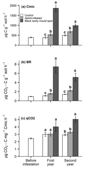 The effect of T. salignus honeydew deposition on (a) soil microbial biomass (μg C g−1 soil), (b) basal respiration (μg CO2-C g−1 soil h−1), and (c) metabolic quotient over time (μg CO2-C μg−1 Cmic h−1), prior to aphid inoculation (before infestation), and after aphid inoculation (control, aphid-infested, and black sooty mould spots) in the first and second year. The values are the means ± SE. Different letters indicate statistically significant differences at each sampling time (Tukey’s HSD test, α = 0.05).
