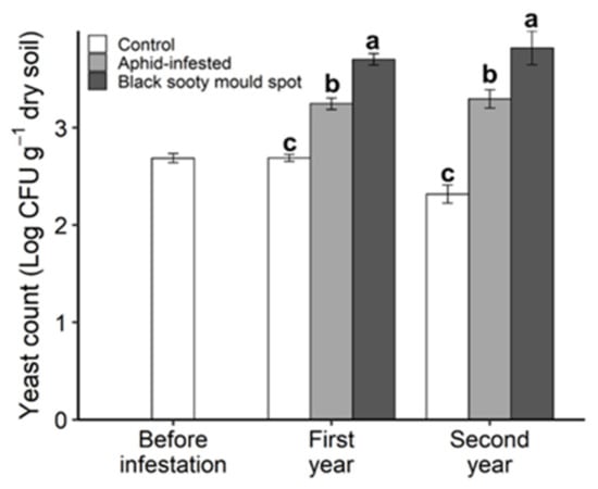 In both years, soil Cmic (Figure 5a), basal respiration (Figure 5b) and yeast CFU (Figure 6) increased in the order: control > aphid-infested > sooty mould spots, with all differences being significant. The microbial quotient (qCO2) was significantly higher in the black sooty mould spots than in the aphid-infested and control treatments only in the second year (Figure 5c).