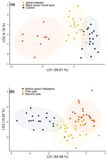 The PCA-LDA showed the localized effect of the honeydew deposition in the black sooty mould spots, and the change after aphid infestation (Figure 7).