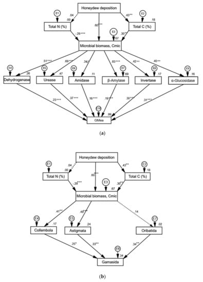 The SEM for the soil meso-fauna abundance had a better fit to the data (χ2 = 87.3, df(36–19) = 17, p < 0.001, RMSEA = 0.00, CFI = 1, AIC = 72.0). The honeydew deposition increased the Cmic, which increased the abundance of the Collembola and Astigmata, but no significant effect was found for Oribatida mites (Figure 8b). The abundance of Gamasida was positively correlated with the abundance of their prey—Collembola, Astigmata and Oribatida.