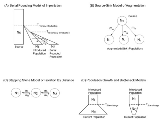 (b) Introduced populations of biological control organisms are often small. Thus their successful establishment depends on numerous factors, including adaptability to local environments, availability of hosts/prey and competitors. Modeling effective population size declines are thus informative of changes in genomic diversity in introduced populations and of potential utility in conservation biological control. Alternatively, unsuccessful introductions summarized in References [33,38], are also characterized by declining population sizes. Population size declines are often modeled using a bottleneck model for inbred, small populations [39,40], Figure 1D. Models incorporating population size change can estimate population growth or decline rates, along with effective population sizes of founder and introduced populations of biological control organisms. These factors can be used in tracing evolutionary trajectories and effectiveness of biological control (see discussion).