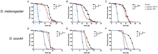Interestingly, we found that D. melanogaster lived longer than D. suzukii in all control cohorts, even though previous studies indicate that D. suzukii lives longer than D. melanogaster under laboratory conditions [67], with a lifespan of 50–154 days [68] compared to 20–52 days [31]. The broad range reflects various factors, such as the health and nutritional status of the flies and the season [69]. Our experimental flies were maintained on a soybean/cornmeal medium diet until the experiments but then on 50 mM sucrose during the exposure and 100 mM sucrose for recovery, which may explain the shorter than usual lifespan of both species in our control cohorts. The cellular immune system of both drosophilid species is similar in structure and response [70] and depends in part on the microbiome [71]. The bacterial communities associated with insects vary by diet and habitat even within the same species, conferring immunity against different location-specific groups of pathogens [72,73]. We tested established laboratory strains of both drosophilid species, and previous studies have shown that laboratory strains often harbor more limited bacterial communities than wild counterparts because the standardized conditions and diet exert little selective pressure for microbiome diversity [74,75]. However, the advantage of standardized conditions and a simple diet is their ability to reveal any intrinsic differences in the virulence of L. pseudomesenteroides towards these two drosophilid species. The greater virulence of this bacterium towards the invasive pest D. suzukii compared to the model D. melanogaster is desirable because it allows the development of host-restricted biocontrol agents.