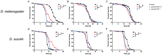 Survival curves for the septic infection of Drosophila melanogaster and D. suzukii with Leuconostoc pseudomesenteroides. Adult flies (3–10 days old) were injected with 4.6 nL of L. pseudomesenteroides suspension (OD600 = 1 or 0.1) or a PBS control. Each survival assay was carried out three times (biological replicates) with three technical replicates (n = 540). A logrank test was used for statistical analysis. (A–C) All three biological replicates of survival assays with D. melanogaster. (D–F) All three biological replicates of survival assays with D. suzukii. Statistical significance is indicated as follows: p ≤ 0.0009 ***; p ≤ 0.09 *; ns, not significant.