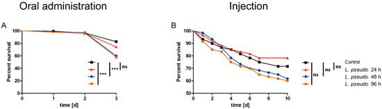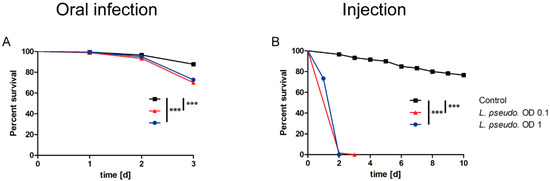 As part of our ongoing effort to isolate new entomopathogenic bacteria, we identified a Leuconostoc pseudomesenteroides strain that strongly inhibited the growth of drosophilids in our initial screening assay [54]. Leuconostoc spp. are important lactic acid bacteria widely used as starter cultures for the fermentation of vegetables and dairy products, with potential applications as functional food ingredients [55,56,57]. Beneficial and food grade lactic acid bacteria with qualified presumption of safety status could therefore provide a valuable source of alternative biocontrol agents [58]. In this study, we investigated the ability of L. pseudomesenteroides cells and cell-free extracts to inhibit the survival of our three target insects via the oral and septic infection routes. Although lactic acid bacteria are known to interfere with the growth of phytopathogenic bacteria and fungi [59,60], and also entomopathogenic bacteria [61], little is known about their potential as biocontrol agents against insect pests [62].