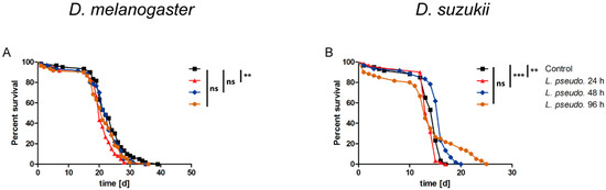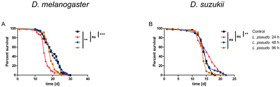 Survival curves for the oral administration of Leuconostoc pseudomesenteroides extracts to (A) Drosophila melanogaster and (B) D. suzukii. Adult flies (3–10 days old) were starved for 5–6 h before L. pseudomesenteroides extracts (12 droplets, each 3 µL) were presented for 2–3 h. The extracts were prepared after bacterial cultivation for 24, 48 or 96 h, and an extract of sterile culture medium was used as a control. A logrank test was used for statistical analysis. Each graph represents three biological replicates, each comprising three technical replicates (n = 180 flies per treatment, making a total of 720 flies per species). Statistical significance is indicated as follows: p ≤ 0.0009 ***; p ≤ 0.009 **; ns, not significant.