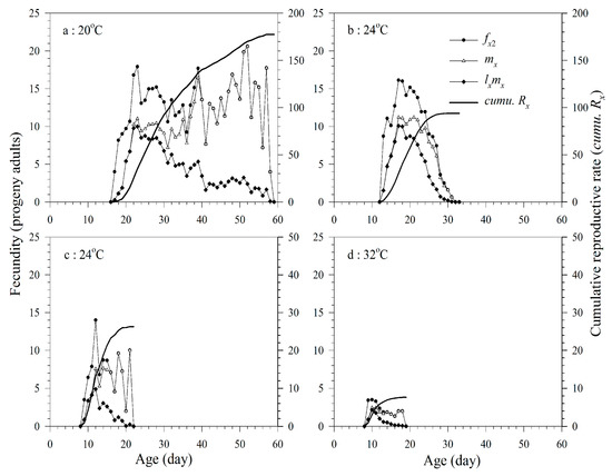Age-stage-specific fecundity (fx2), age-specific fecundity (mx), age-specific net fecundity (lxmx), and cumulative reproductive rates (cumu. Rx) of A. asychis parasitizing M. persicae at 20 °C (a), 24 °C (b), 28 °C (c) and 32 °C (d).