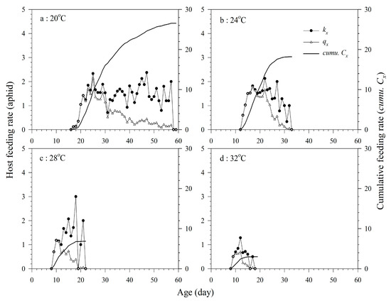 The host feeding behaviors of A. asychis on some host species have been previously studied. It was noted that aphids fed on by A. asychis females were first paralyzed and usually died after feeding [18]. In addition, A. gossypii nymphs and adults were acceptable for host feeding by A. asychis, and the number of younger instar aphids for host feeding was higher than that of older instars [53]. They speculated that older aphids were larger and richer in nutrients than the younger nymphs, so the female parasitoids needed more young nymphs to obtain nutrients for oogenesis. Additionally, the aphid’s defense reactions may lead to the preference of aphelinids for younger hosts [60,61,62]. Furthermore, the average number of A. gossypii infesting cucumbers (Cucumis sativus) and killed by A. asychis by non-reproductive host killing was 73.9 [63]. As shown in our study, an increase in the rearing temperature significantly decreased the C0, and the regression equation for C0 and temperature showed a similar decreasing tendency from 20 to 30 °C. However, the gx showed an irregular variation in the adult stage at all four constant temperatures, and it was higher at mid-term than prophase. This phenomenon indicated that the emergence rate for progenies in the next generation was influenced by female adult age, which was also found in our previous study [13]. In addition, the N0 of aphids killed by A. asychis decreased significantly with increasing temperature in this study, which suggested that N0 might be influenced by temperature.