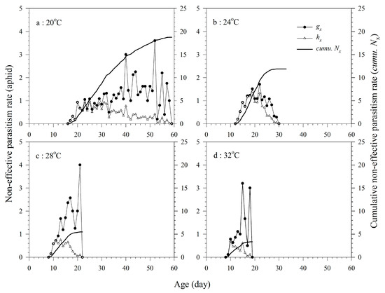 Age-specific non-effective parasitism rates (gx), age-specific net non-effective parasitism rates (hx), and cumulative non-effective parasitism rates (cumu. Nx) of A. asychis parasitizing M. persicae at 20 °C (a), 24 °C (b), 28 °C (c) and 32 °C (d).