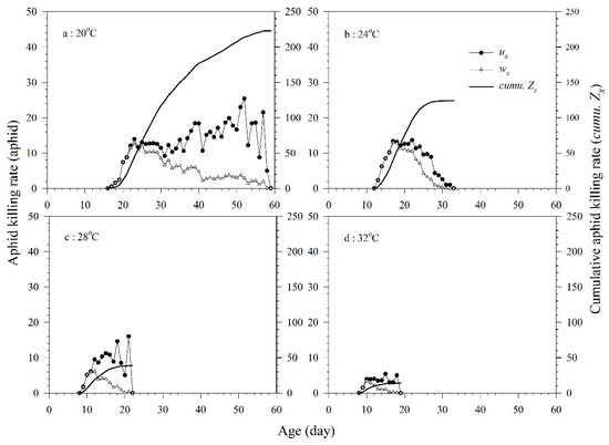 Age-specific aphid killing rates (ux), age-specific net aphid killing rates (wx), and cumulative killing rates (cumu. Zx) of A. asychis parasitizing M. persicae at 20 °C (a), 24 °C (b), 28 °C (c) and 32 °C (d).