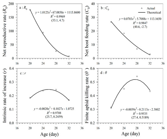 The relationship between population fitness (R0, C0, r, and θ) and temperature is shown in Figure 6. The relationship between population fitness (the net reproductive rate, net feeding rate, intrinsic rate of increase, and finite aphid killing rate) and temperature followed a unary quadratic function as evidenced by the high coefficient of determination (R2), greater than 0.95. The net reproductive rate and net host feeding rate decreased as the temperature increased within the range 20 to 32 °C. The temperature for the expected maximum intrinsic rate of increase (25.7 °C) was lower than that for the maximum finite killing rate (27.4 °C).
