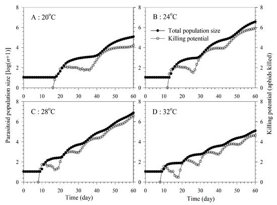 Simulated population growth and killing potential of A. asychis parasitizing M. persicae at 20 °C (a), 24 °C (b), 28 °C (c) and 32 °C (d).