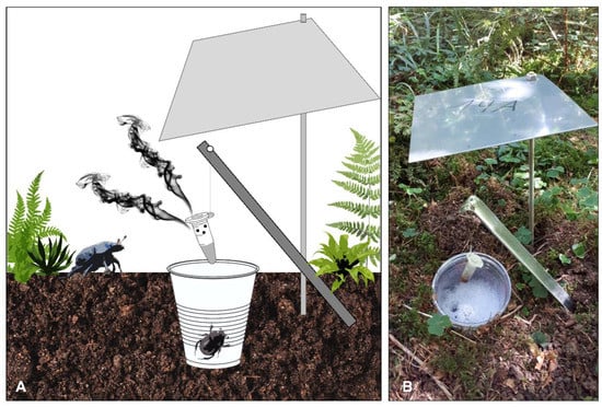 (A) Graphic illustration of a pitfall trap with bait (treatment) in a perforated Eppendorf tube used in the field assays and (B) the corresponding setup as an original image.