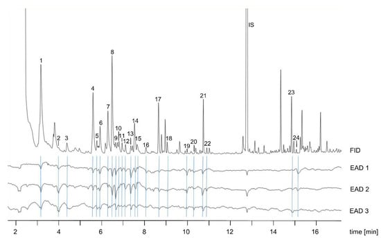 In the electrophysiological assessment of A. stercorosus antennae, we registered 24 EAD active compounds in the post-bloating decay headspace sample (Figure 3). In addition, we found the internal standard (tridecane) also to be electrophysiologically active.