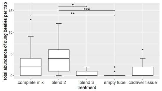 Comparison of the abundance of attracted Anoplotrupes stercorosus individuals among the different treatments (complete mix: all six EAD active compounds (benzaldehyde, dimethyl trisulfide, 3-octanone, 6-methyl-5-hepten-2-ol, nonanal, and dodecane), blend 2: three EAD active compounds (benzaldehyde, dimethyl trisulfide, and 3-octanone), blend 3: three EAD active compounds (6-methyl-5-hepten-2-ol, nonanal, and dodecane), empty tube: negative control, cadaver tissue: positive control). Each box shows the median, 75% percentile, 25% percentile, and highest and smallest non-extreme value within a category, and asterisks indicate significant differences between treatments (Kruskal-Wallis test: χ2 = 31.077, df = 4, p < 0.001; post-hoc Nemenyi tests (p < 0.05): blend 2 vs. blend 3: p = 0.002, complete mix vs. empty tube: p = 0.005, blend 2 vs. empty tube: p < 0.001; significance levels: ns (p > 0.05), * p ≤ 0.05, ** p ≤ 0.01, *** p ≤ 0.001).