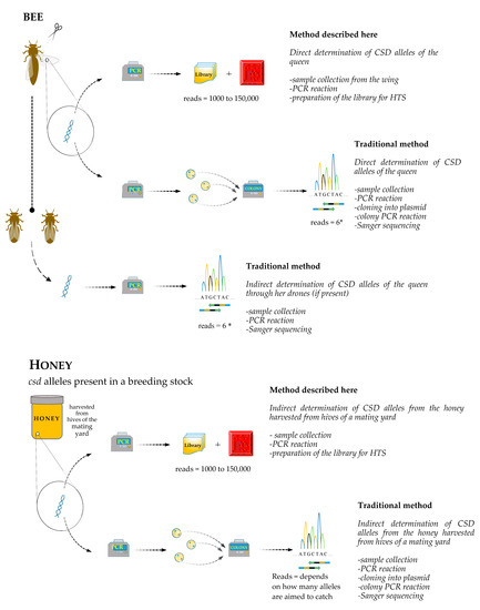 Comparison of the two methods shows that traditional methods provides alternative only when drones are available with a compromise of more DNA extraction and PCR. However, if queen is directly targeted, it leads to extensive molecular cloning and sequencing. The advantage of the novel approach is disputable when investigating bulk samples.* In order to successfully catch both alleles, 6 sequencing is optimal.