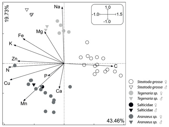 Principal component analysis (PCA) plot—multivariate analysis of stoichiometric relations in spider taxa and sexes. The first two axes are presented. Considering the 1st axis, females are separated from males primarily due to their relatively high concentration of C and low concentrations of N, Cu, K and Zn (see Table 2 and Figure 2 for detailed statistics). Similarly, Steatoda grossa is separated from the other taxa due to its relatively high concentration of C and low concentrations of N, Cu, K and Zn (the other taxa do not differ statistically from each other; see Table 2 and Figure 3 for statistics). Considering the 2nd axis, Tegenaria sp. forms a separate cluster mainly due to its relatively high concentrations of Na and Mg and low concentration of Mn. An opposite tendency is observed for Araneus sp., while Steatoda grossa together with Salticidae forms one cluster with intermediate concentrations of Na, Mg and Mn. These tendencies were confirmed by ANOVA performed independently for the 1st and 2nd axis scores (p < 0.05; Figure 2, Figure 3 and Figure 4).