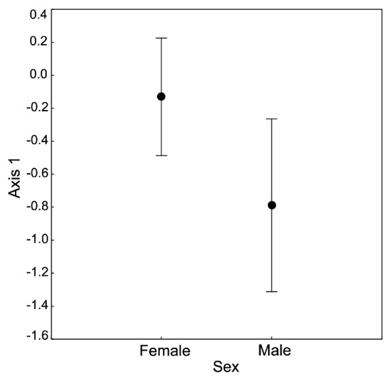 Multivariate analysis of stoichiometric relations in two sexes of spiders (PCA). ANOVA performed for the 1st axis scores (F = 4.46, p = 0.04). Bars denote the confidence intervals. Table 1 provides information on the contribution of different elements to the scores of Axis 1.