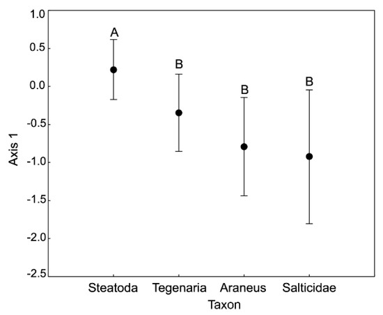 Multivariate analysis of stoichiometric relations in the four taxa of spiders (PCA). ANOVA performed for the 1st axis scores. Different letters denote significant differences in multielemental stoichiometry between taxa (F = 18.70, p = 0.02). Bars denote the confidence intervals. Table 1 provides information on the contribution of different elements to the scores of Axis 1.