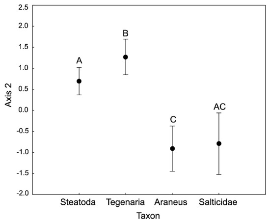 Multivariate analysis of stoichiometric relations in the four taxa of spiders (PCA). ANOVA performed for the 2nd axis scores. Different letters denote significant differences in multielemental stoichiometry between taxa (F = 3.78, p < 0.00001). Bars denote the confidence intervals. Table 1 provides information on the contribution of different elements to the scores of Axis 2.