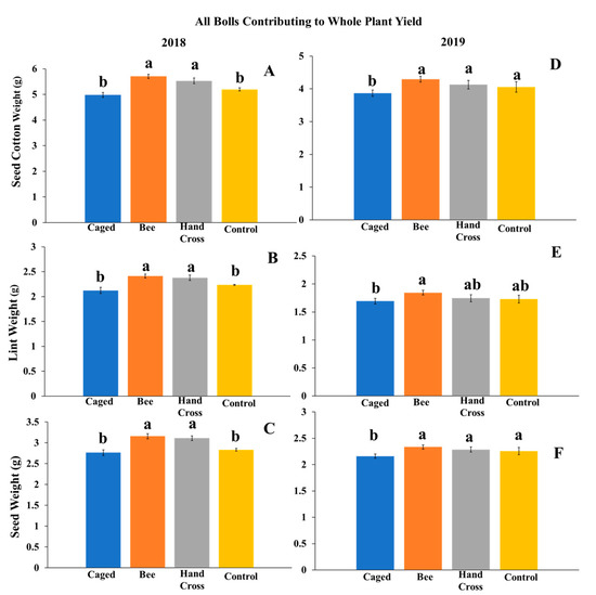 Evaluating three cotton yield measurements of whole plant yield on a per-boll basis across four treatments using all harvestable bolls on a group of 4 plants across (A–C) 2018 and (D–F) 2019. The numbers of bolls used in the analysis were as follows. In 2018: bolls from caged flowers excluded from Melissodes tepaneca (118), bolls from bee-pollinated flowers (n = 92), bolls from hand-crossed flowers (85), and bolls from uncaged flowers (135). “n” represents the number of bolls aggregated for analysis across the treatments. In 2019: bolls from caged flowers excluded from M. tepaneca (248), bolls from bee-pollinated flowers (n = 382), bolls from hand-crossed flowers (369), and bolls from uncaged flowers (307). Letters represent a significant difference at the α = 0.05 significance level using Tukey’s mean separation test.
