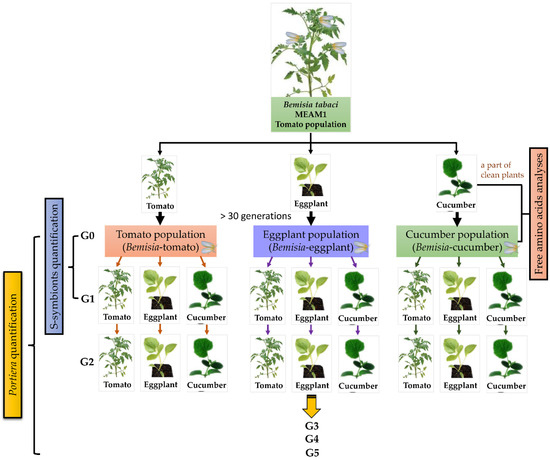 From each population, about 150 five-day-old female adults (termed G0) were collected to measure the symbiont abundance. Between 150 and 200 adults were transferred to the natal or novel species for 24 h to lay eggs. The adults were then removed, and the eggs were allowed to develop. About 150 five-day-old G1 female adults were collected and the symbionts quantified. The remaining G1 adults were transferred to the three plant species to allow egg-laying for 24 h, following which, the adults were removed. About one month later, 150 five-day-old female adults (G2) were collected and stored in ethanol at −20 °C. The remaining G2 adults were transferred to fresh plants for the production of the third generation. The third (G3), fourth (G4), and fifth (G5) generation samples were collected similarly. The plant switch experiments were performed as shown in Figure 1. The G0 and G1 samples with six replicates for each treatment were used to quantify all detected symbionts, and the G2–G5 samples with six replicates for each treatment were sampled to quantify Portiera.