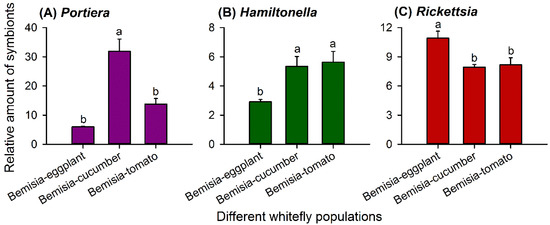 Relative abundance of Portiera (A), Hamiltonella (B), and Rickettsia (C) (mean ± SE) in whitefly populations G0 of Bemisia-eggplants, Bemisia-cucumbers, and Bemisia-tomatoes. The relative amount of each symbiont taxon was normalized using β-actin and calculated by the 2-ΔCt method. Statistical analyses were carried out separately for each symbiont taxon; different letters above the error bars indicate significant differences for that taxon among the three whitefly populations (p < 0.05, Tukey’s honest significant difference (HSD) test).