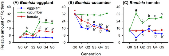 Relative amounts of Portiera (mean ± SE) in whitefly populations of Bemisia-eggplants (A), Bemisia-cucumbers (B), and Bemisia-tomatoes (C) transferred to natal and novel host-plant species for different generations, ranging from G0 to G5. The relative amount of each symbiont taxon was normalized using β-actin and calculated by the 2-ΔCt method. Different lowercase letters and lowercase letter variants, i.e., a′, b’ and c′, around the error bars indicate significant differences among different generations after a transfer to a novel host-plant species (p < 0.05, Tukey’s HSD test).
