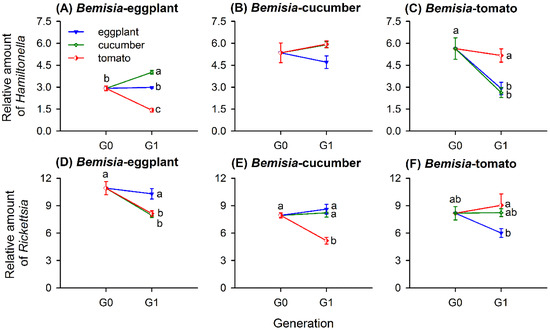 Relative amounts of Hamiltonella and Rickettsia (mean ± SE) in whitefly populations of Bemisia-eggplants (A,D), Bemisia-cucumbers (B,E), and Bemisia-tomatoes (C,F) transferred to natal and two novel host-plant species for one generation. The relative amounts of each symbiont taxon were normalized using β-actin and calculated by the 2-ΔCt method. Different lowercase letters around the error bars of each whitefly population indicate significant difference of Hamiltonella or Rickettsia when transferred to different plant species (p < 0.05, Tukey’s HSD test).
