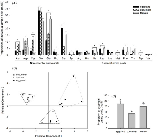 Proportions of individual amino acids (mean ± SE) (mol%; A), amino acid–composition analysis by principle component analysis (PCA) (B), and percentage of the entire essential amino acids (EAAs) in the phloem sap of eggplant, cucumber, and tomato leaves (mol%; C). Non-EAAs: Ala, alanine; Asp, aspartic acid; Cys, cysteine; Gln, glutamine; Glu, glutamic acid; Pro, proline; Ser, serine; and Tyr, tyrosine. EAAs: Arg, arginine; His, histidine; Ile, isoleucine; Leu, leucine; Lys, lysine; Met, methionine; Phe, phenylalanine; Thr, threonine; Trp, tryptophan; and Val, valine. Asterisk or different letters above the error bars indicate significant differences in individual amino acids or percentage of the entire EAAs among the three plant species (p < 0.05, Tukey’s HSD test).