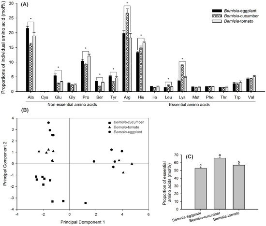 Proportions of individual amino acids (mean ± SE; mol%; A), amino acid composition–profile analysis by PCA (B), and percentage of the entire EAAs in three whitefly populations (G0), termed Bemisia-eggplants, Bemisia-cucumbers, and Bemisia-tomatoes (mol%) (C). Asterisks or different letters above the error bars indicate significant differences in individual amino-acid levels or percentage of the entire EAAs among the whitefly populations (p < 0.05, Tukey’s HSD test).