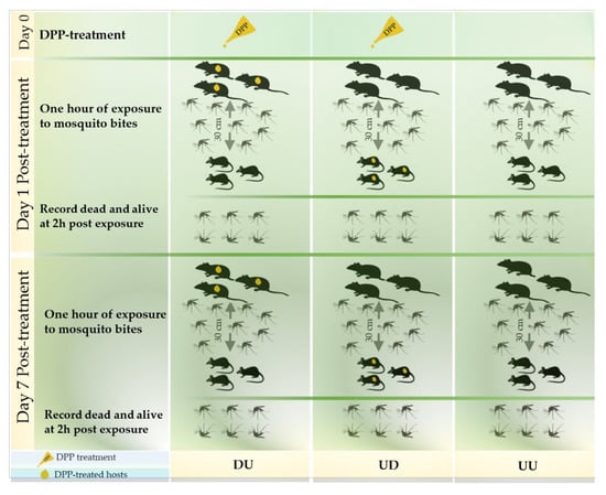 After an acclimation period, the animals were allocated into three groups of three rats and three mice each and were named TU, UT, and UU according to their treatment statues, where TU corresponds to DPP treated rats (n = 3) with untreated mice (n = 3), UT: untreated rats (n = 3) with DPP treated mice (n = 3) and UU: untreated rats (n = 3) and untreated mice (n = 3). This latter was used as control group. Once treatment has been applied, rats and mice from each group were housed in separate cages and maintained under the same conditions. The exposure to mosquito bites was performed twice at day 1 and day 7 post-treatment in order to determine the persistence of the repellent and killing effects.