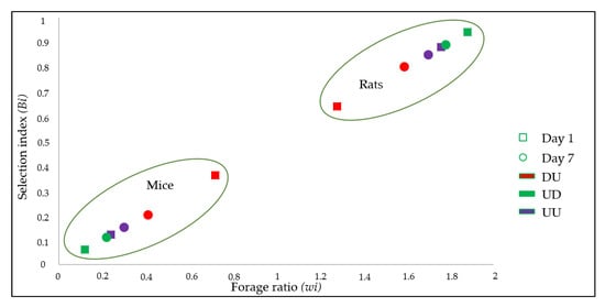 Scatter chart showing feeding preferences of Ae. albopictus mosquitoes in term of hosts and treatments according to the forage ratio (wi) and selection index (Bi). DU: DPP-treated rats vs. untreated mice, UD: DPP-treated mice vs. untreated rats, UU: Control group. Day 1 and 7: Time of post-treatment exposure.