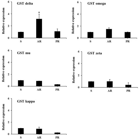 Relative expression levels of GST subclasses in the S, AR, and PR strains of T. urticae. The vertical bars indicate standard errors of the means (n = 3, 4). * p < 0.05 [26].