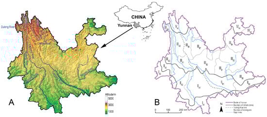 The geographical position and topological character (A), and the schematic map of the ecological zonation system of Yunnan Province (B).