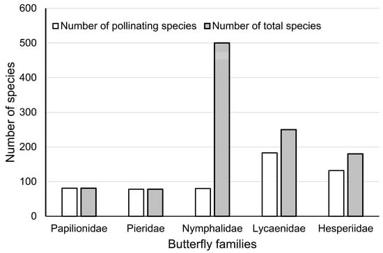 A total of 554 pollinating butterflies (50.8%) were screened from literature and specimen records (Table S1), with 81 species of Papilionidae (100%), 78 species of Pieridae (100%), 80 species of Nymphalidae (16.0%), 183 species of Lycaenidae (73.2%), and 132 species of Hesperiidae (73.3%) (Figure 2).