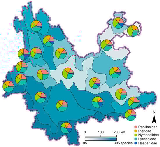 The number of pollinating butterflies as well as the number of total species in each family was graphed into a bar chart. The number of pollinating species in each ecoregion with family composition were visualised on a map using ArcMap 10.0 (Esri, Redlands, CA, USA) to show the spatial pattern of species richness.