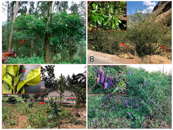 Examples of butterfly attracting plants in Chinese agroecosystems. (A): Zanthoxylum bush (red arrow) in Zones C–H; (B): Zanthoxylum bushes as fence (red arrows) in Zones C–H, with close up of fruiting branches in the red box.; (C): Pomelo trees along the edge of field in Zones A, B, D, and E (red arrows), with a pupa of Papilio memnon attached to a branch in the red box (red arrow); (D): Vicia cracca during the seasonal rotation in Zones C–I, with close up of flowers in the red box.