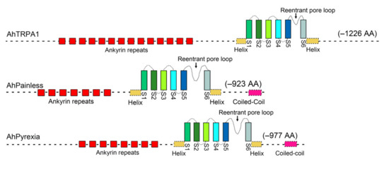 The complete ORF of the A. hygrophila TRPA1 (AhTRPA1) gene is 3681 bp in length and encodes a protein of 1226 amino acids, with a molecular mass of 138.90 kDa and an isoelectric point of 7.42. It contains 14 ankyrin repeats from amino acid (AA) 151–666 at the N-terminus and six ion channel-forming transmembrane domains from AA 807–1063 at the C-terminus (Figure 1), (Figure S1). The complete ORF of AhPainless gene is 2772 bp in length and encodes a protein of 923 amino acids, with a molecular mass of 106.15 kDa and an isoelectric point of 7.45. AhPainless has seven ankyrin repeats located in AA 62–420 at the N-terminus, and six ion channel-forming transmembrane domains located in AA 532–772, and a coiled coil in AA 891–923 at the C-terminus (Figure 1), (Figure S2). The complete ORF of the AhPyrexia gene is 2934 bp in length and encodes a protein of 977 amino acids, with a molecular mass of 110.10 kDa and an isoelectric point of 6.21. AhPyrexia contains eight Ankyrin repeats located in 190–459 at N-terminus, six ion channel-forming transmembrane domains located in in AA 554–809, and a coiled coil in AA 927–967 at the C-terminus (Figure 1), (Figure S3).