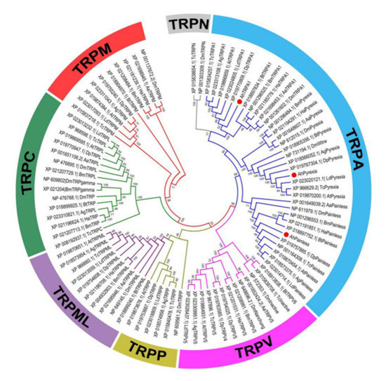 3.2. Phylogenetic Analysis of A. hygrophila TRPAs with TRPs from Other Insects