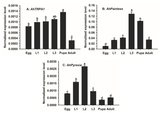 Developmental expression profiles of (A) AhTRPA1, (B) AhPainless, and (C) AhPyrexia in Agasicles hygrophila. Each developmental stage comprised three biological replicates. Data of the bar chart are expressed as mean ±SE. The differences in the expression during different developmental stages were analyzed using one-way ANOVA and Turkey’s honest significant difference (HSD) test. Different lowercase letters represent significant differences at p < 0.05.