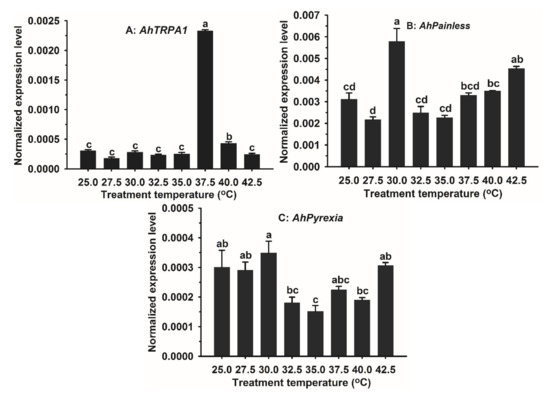 As egg was the most vulnerable stage of A. hygrophila to hot temperature in the summer [40], we exposed its eggs to 25 (control), 27.5, 30, 32.5, 35, 37.5, 40, or 42.5 °C for 1 h and then analyzed the expressions of AhTRPA1, AhPainless, and AhPyrexia genes in the A. hygrophila eggs treated with one of the eight different temperatures. The expression of AhTRPA1 remained unchanged from 25–35 °C, sharply elevated 7.3-fold to its highest level (peak expression) at 37.5 °C, dramatically reduced 6.0-fold at 40 °C, and finally dropped back to the expression level of 25–35 °C at 42.5 °C (Figure 4A). The expression of AhPainless did not change significantly with the increase of temperature except for 30 and 42.5 °C that significantly induced expression of this gene (Figure 4B). The peak expression of AhPainless occurred at 30 °C, which was marginally higher than that at 42.5 °C (Figure 4B). Similarly, the expression of AhPyrexia did not change significantly with the increase of temperature except for 35 °C (Figure 4C). The expression of AhPyrexia at 35 °C was significantly lower than that at 25, 27.5, 30, and 42.5 °C, respectively (Figure 4C).