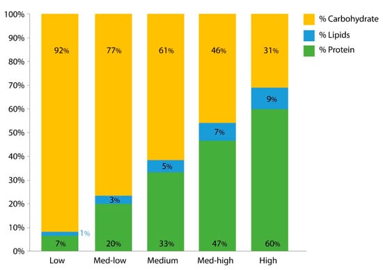 Figure 1. Carbohydrate, fat, and protein composition of the 5 diets composed of varying ratios of autolyzed yeast (AY) and rice flour (RF). The diet ratios are as follows: Low = All RF, Low-Med = 1 part AY: 3 parts RF, Med =1 AY:1 RF, High-med 3 AY:1 RF, High = All AY. Nomenclature represents relative amount of protein associated with each diet.