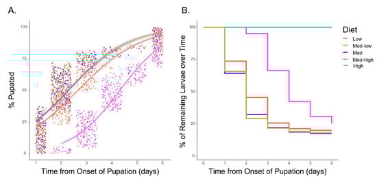Figure 2. Analysis of pupation rates on different diets. (A) Analysis of pupation rate by diet. Points represent the time to pupation for individual mosquitoes within each diet relative to initiation of pupation across all groups. Trend lines represent generalized linear models derived from the data for each diet. Grey areas above and below the trendlines represent 95% confidence intervals. (B) Kaplan–Meier Survival analysis shows the percent of remaining larvae for each diet over the six days following onset of pupation. Pairwise comparison by log-rank test of all diets resulted in significant differences between pupation rates (p < 0.001) for all comparisons with the exception of the Med–low and Med diets.