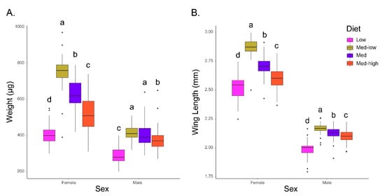 Figure 3. Analysis of dietary impacts on body size. (A) Dry body weight in µg. Adults were frozen and then dried for 24 hours before weighing. (B) Wing Length in mm. Mosquitoes were measured from alula to the end of the radial vein excluding fringe scales. Letter annotations represent statistical groups (p < 0.05) as determined by Kruskall–Wallis test followed by pairwise scoring using the Wilcoxon signed-rank test. Bars sharing letters are not significantly different. Statistical comparisons are only within sex. p-value matrices available in Supplementary File S2.