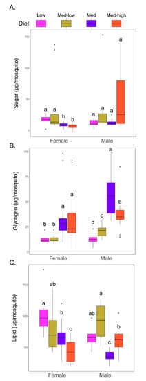 Figure 4. Effect of larval diet on Nutrition Stores of (A) Sugar, (B) Glycogen, and (C) Lipids. Letter annotations represent statistical groups (p < 0.05) as determined by Kruskall-Wallis test followed by pairwise scoring using the Wilcoxon signed-rank test for both sexes. Bars sharing letters are not significantly different. Statistical comparisons are only within sex.