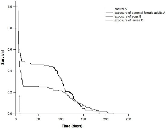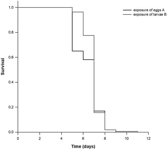 Survival curves of cohorts of Tribolium castaneum eggs, larvae, and progeny of parental female adults exposed to concrete treated with chlorfenapyr. The survival curves of the treatments followed by the same letter are not statistically different.