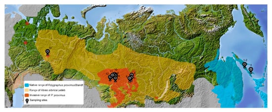 We studied Wolbachia infection in native and invasive populations of the four-eyed fir bark beetle Polygraphus proximus Blandford, 1894 (Coleoptera; Curculionidae: Scolytinae). This species is one of the most dangerous pests of Siberian fir (Abies sibirica) forests. Since 2014, P. proximus has been listed in the European and Mediterranean Plant Protection Organization (EPPO) Alert List (https://gd.eppo.int/taxon/POLGPR). The native range of P. proximus includes the territories of the Russian Far East, Japan, Korea, and Northeast China [23,24,25]. The secondary (invasive) range covers the territories of West Siberia [24,25], with further expansion occurring westward (Figure 1).