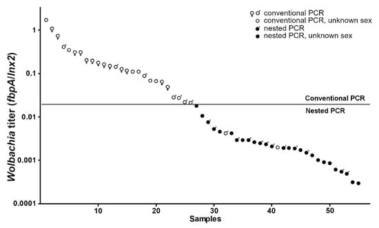 The values of Wolbachia genomes per beetle genome were measured by real-time quantitative PCR. Here, we used 27 conventional-positive and 28 nested-positive samples across all regions; among them were 13 females, 20 males, and 22 samples with undetermined sex. Variation of the Wolbachia copy number (fbpA/Inx2) was in the range of 2.9 × 10−4 to 1.73. Our results for the conventional and nested PCR were in a good agreement with the estimation of Wolbachia load by qPCR. The threshold of the two PCR approaches was about 0.018–0.020 (Figure 2). The differences between the most heavily and lowest infected females was 22-fold, and the difference was 864-fold in males. The median of the Wolbachia titer was 0.1792 in females and 0.0035 in males, which was a significant difference (U Mann–Whitney p < 0.0001). In particular, there were no females below the threshold, whereas there were seven males (detected by conventional PCR) above it. In two cases, Wolbachia infection was successfully detected by conventional PCR, although the infection titers were ~0.002 and 0.005.