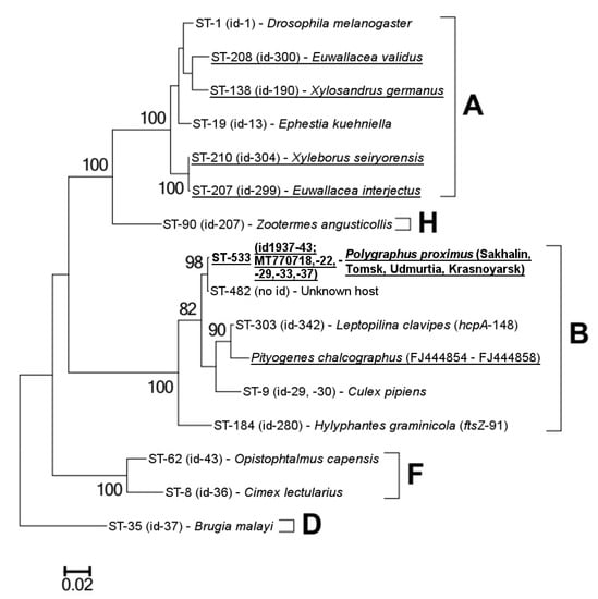 The maximum likelihood (ML) phylogenetic tree of Wolbachia isolates was reconstructed based on concatenated sequences of five multilocus sequence typing (MLST) genes using the GTR model of nucleotide replacement. The sequence type (ST), ID (id) numbers from the PubMLST database, and GenBank accession numbers, with host species, supergroups, and bootstrap values higher than 75 (1000 replicates), are indicated. Wolbachia isolates of the Scolytinae species are underlined. Studied isolates of ST-533 are in bold.